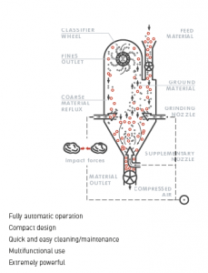Its special strength is the processing of abrasive, high-purity and gluey products. The working principle of MultiNo®-M/S/M is based on the propulsion of particles by compressed air. Colliding at high speed, the particles are reduced in size. The benefits of “product-on-product grinding”: no product contamination by other materials, gentle processing and minimized wear-and-tear costs due to abrasion-free grinding. When used as a technical laboratory system – in testing and/or in the production of small quantities – optimum results and minimum product consumption are guaranteed.
