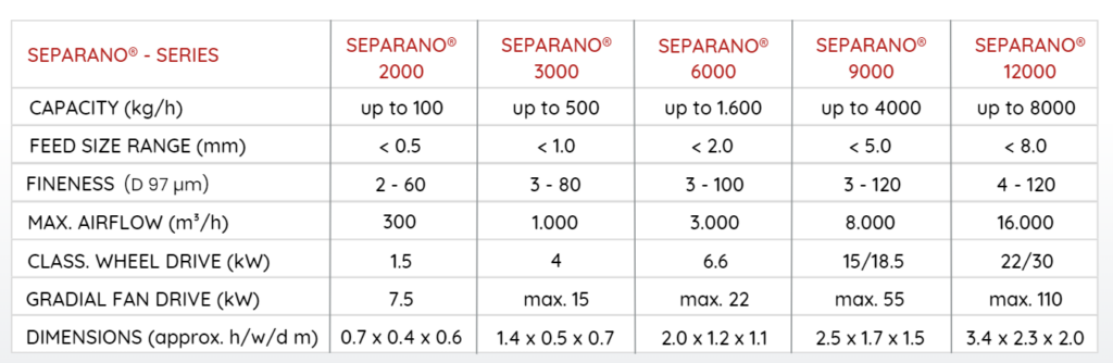 NOLL‘s SeparaNo®-E classifier series – specially designed for the classification of non-abrasive and non-sticky materials – represents a new, revolutionary classifying technology. We have reversed the classifier‘s direction of flow and provide a new, improved product input. We have also optimized housing geometry: the classifier‘s arrangement is now eccentric, permitting a considerable reduction of the additional air required, while minimizing abrasion. Neither coarse particles nor grinding elements get in the way of classifying performance.